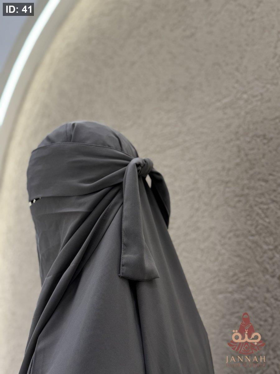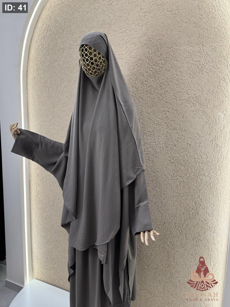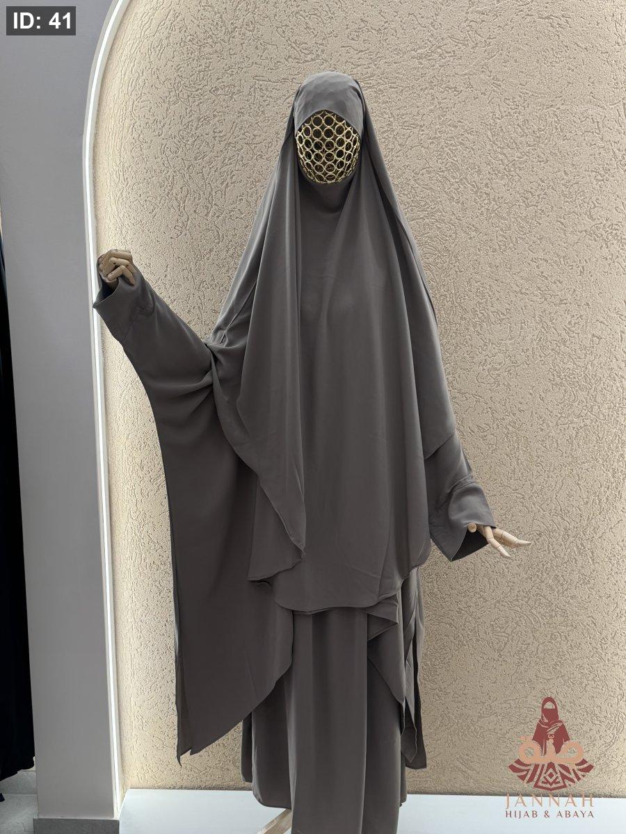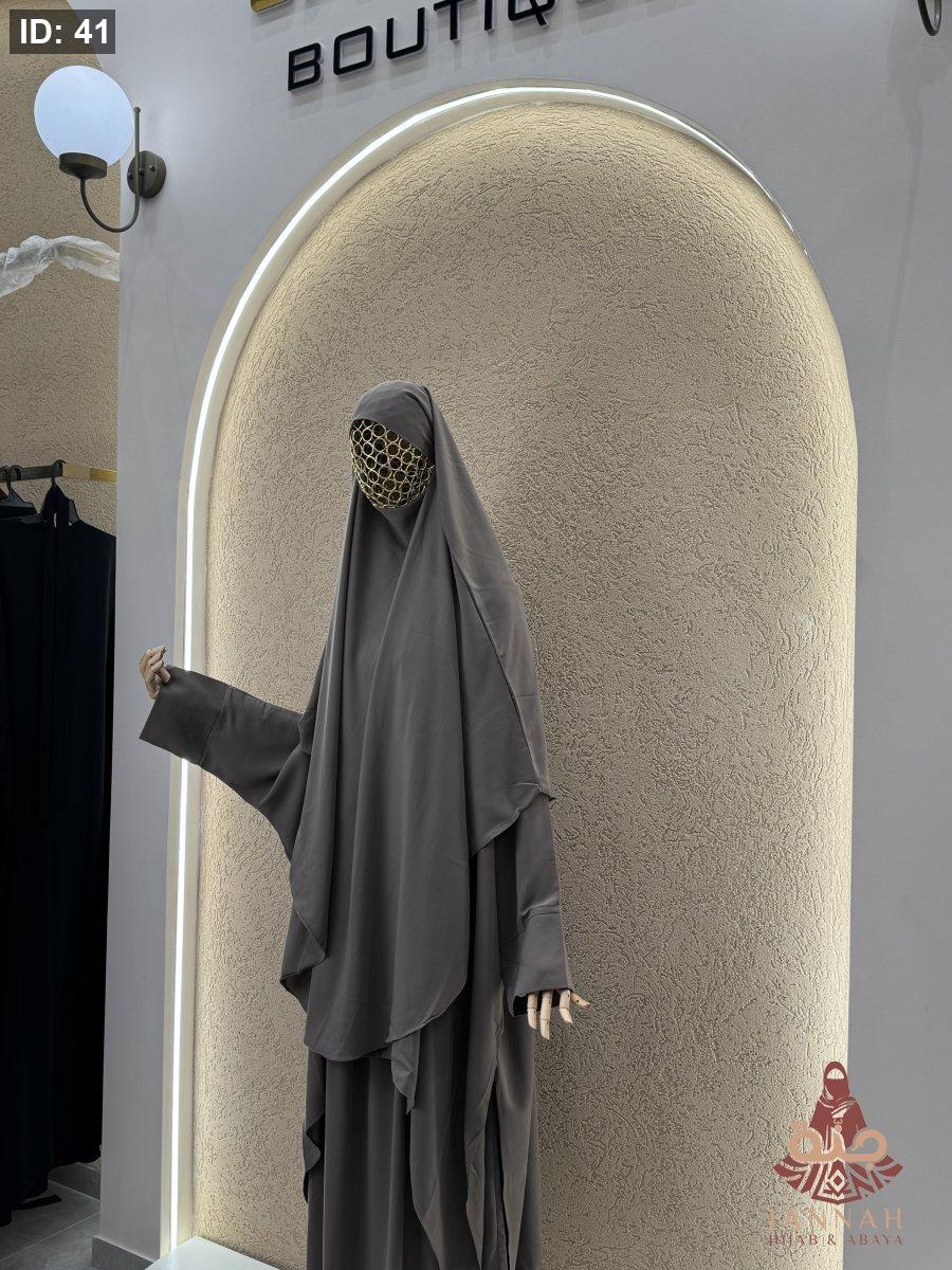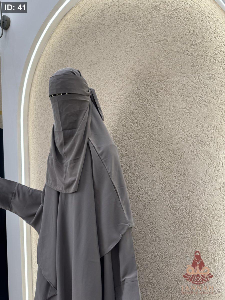 طقم مكون من تنورة وبلوز طويل واسمع وخمار طويل طبقة واحدة والنقاب تندة (اختياري)