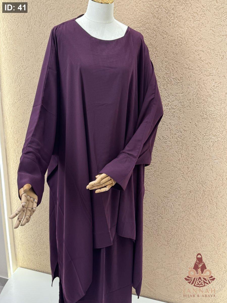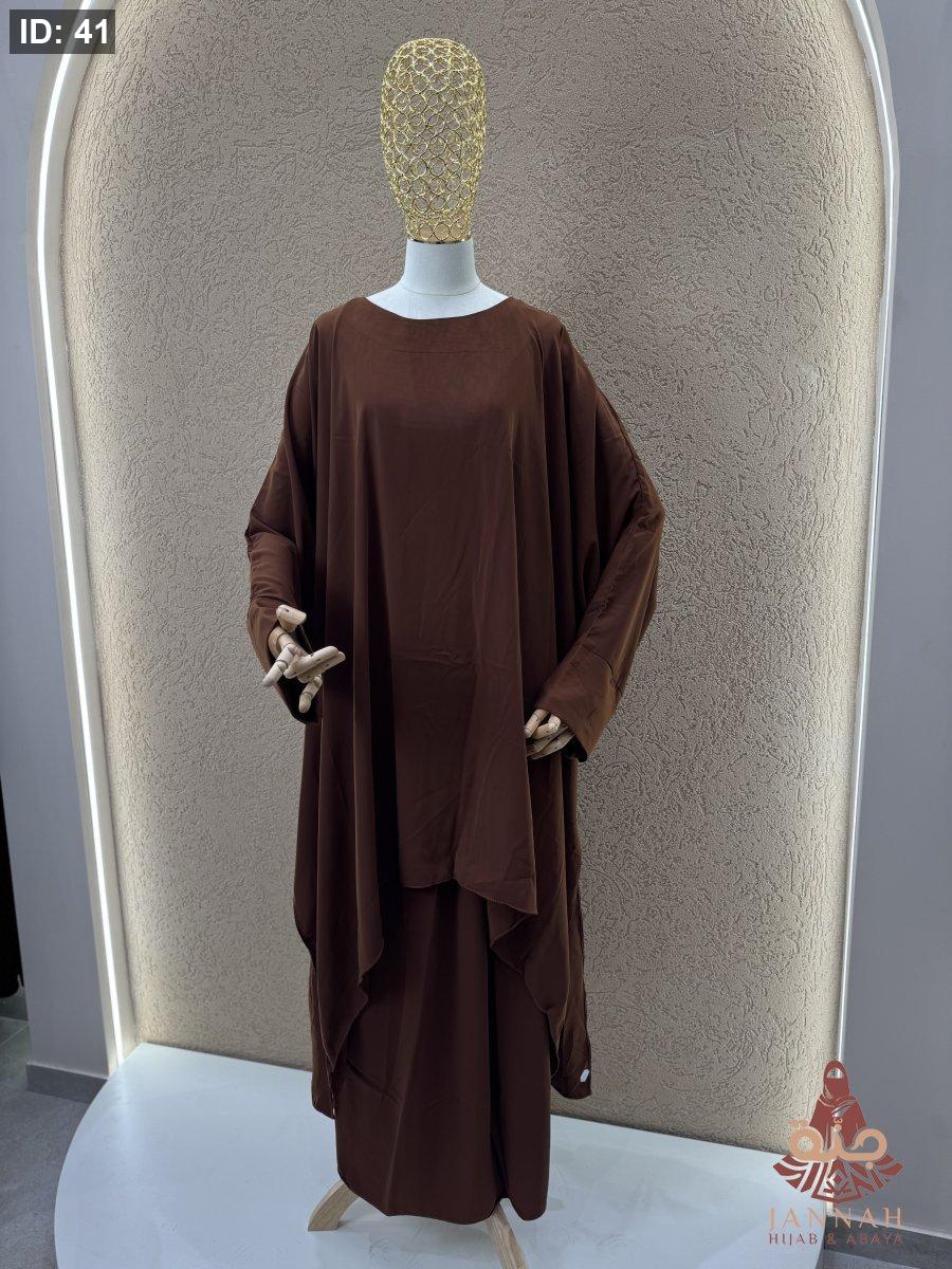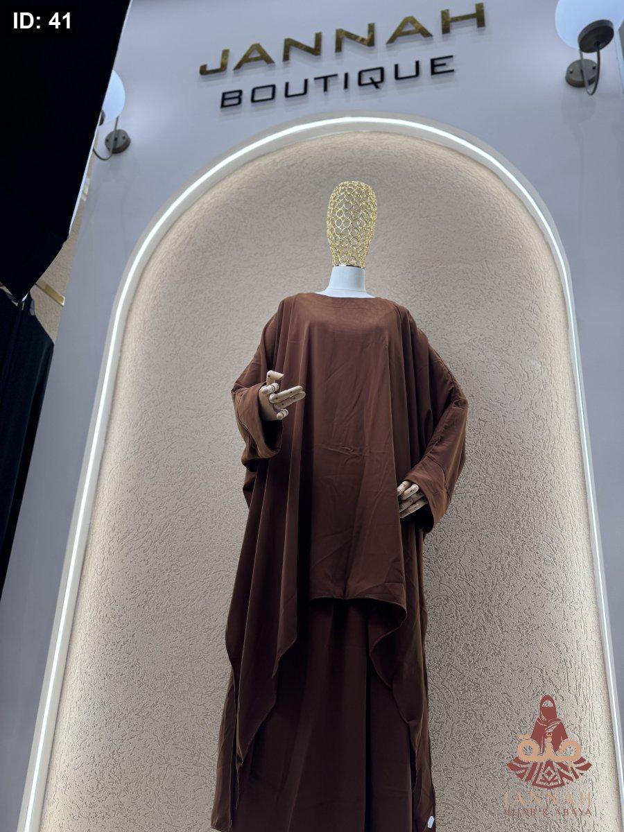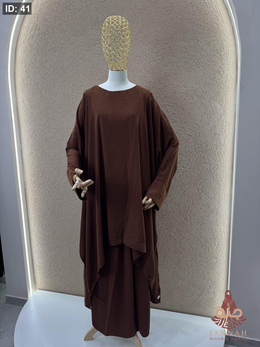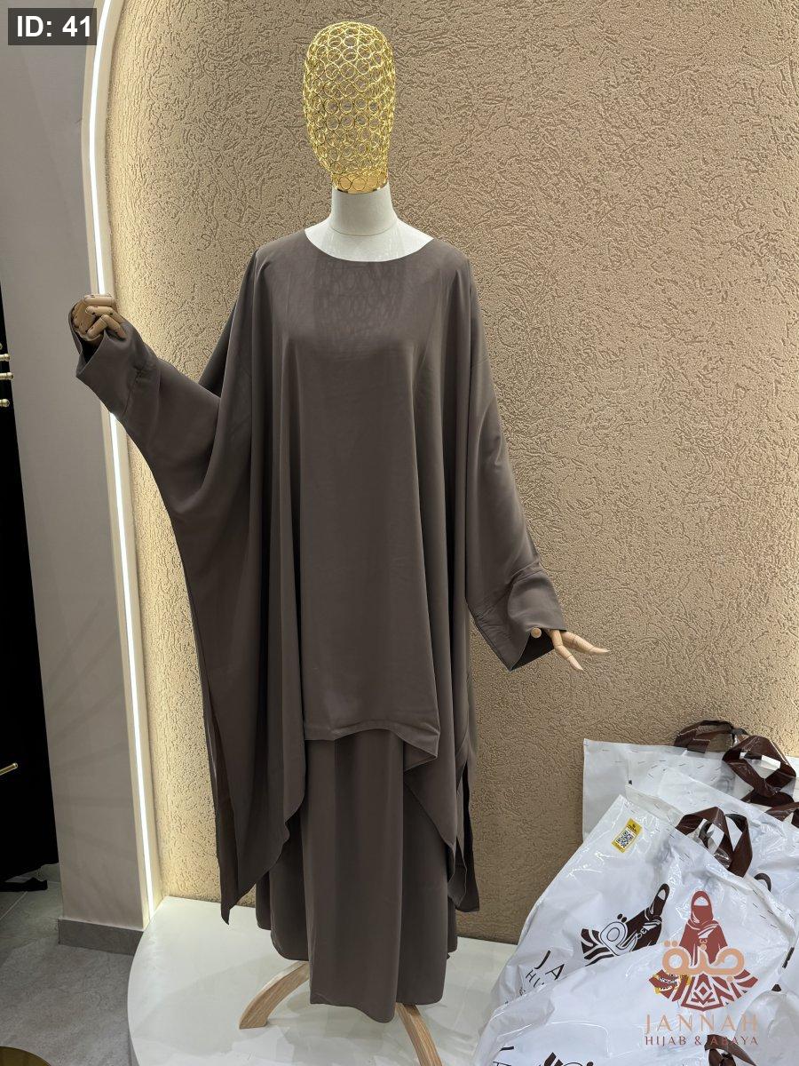 طقم مكون من تنورة وبلوز طويل واسمع وخمار طويل طبقة واحدة والنقاب تندة (اختياري)